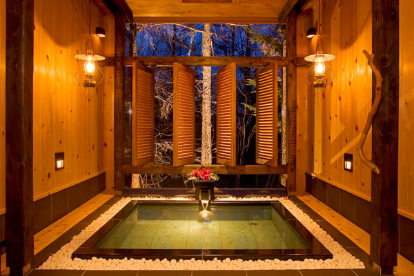 目の前には蓼科の森が広がり、森林浴気分をたっぷり満喫できる、貸し切り風呂。湯船から上を見上げると小さな天窓。 昼は陽の光にきらめく木々の緑を、夜は照明をおとして星空を眺めながら、癒しのひとときをお楽しみください。